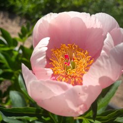 Pionen Kiev är en öppen rosa pion med lite lägre höjd (50cm)