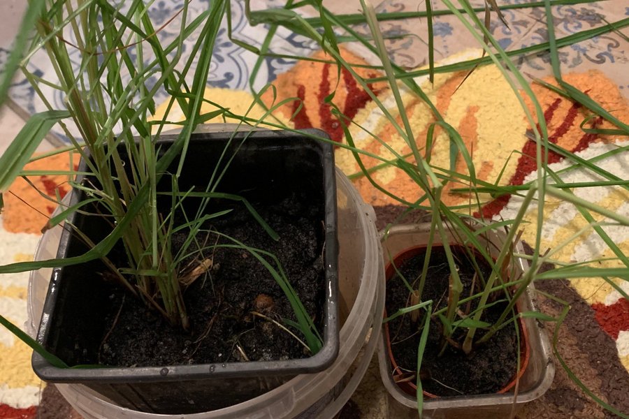 Två krukor med citrongräs för matlagning. Behöver omplanteras för att få tjocka stjälkar.