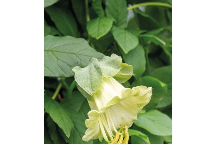 Ståtlig klätterväxt med imponerande vita klockformade blommor och vackert bladverk. Kan odlas i kruka eller rabatt, längs en spaljé eller annat stöd för klättring.