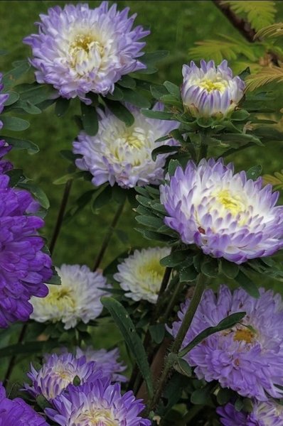 Stora, vita blommor med lavendelblå kronbladsspetsar. Extra dubbel och pionblommande på stadiga stjälkar. Utmärkt för både rabatt och snitt. Avser tio frö