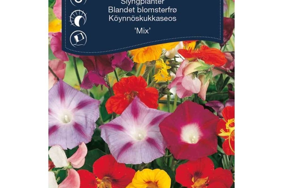 En blandning av rankade växter med 1,5 - 2 meter långa rankor. Ger blommor under en lång tid. Bind upp rankor efter hand eller låt dem hänga ner från balkonglådan.