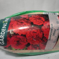 Fluorette röd ros. En buskros som passar för plantering i trädgården. Rosen är rotad och redo för plantering.