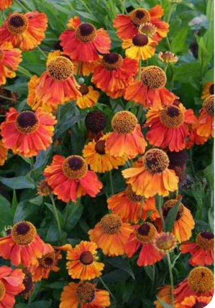 Blommar med orangeröda kronblad och en mörkbrun mitt. Växten blir cirka 90-100 cm hög.