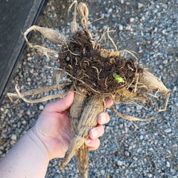 En dahlia knöl av fina Ankara. Blommvillig sort perfekt för att använda i buketter. Ett öga har vaknat. Växt utan tecken på virus eller sjukdom i somras.