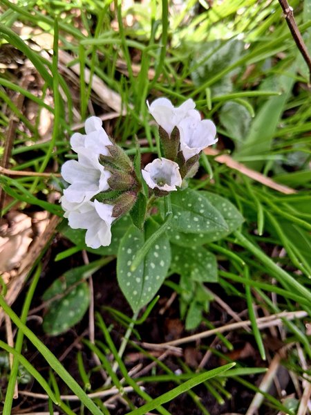 Lungört med vita blommor och fläckiga blad. Drar till sig humlor nu tidigt på våren.En planta
