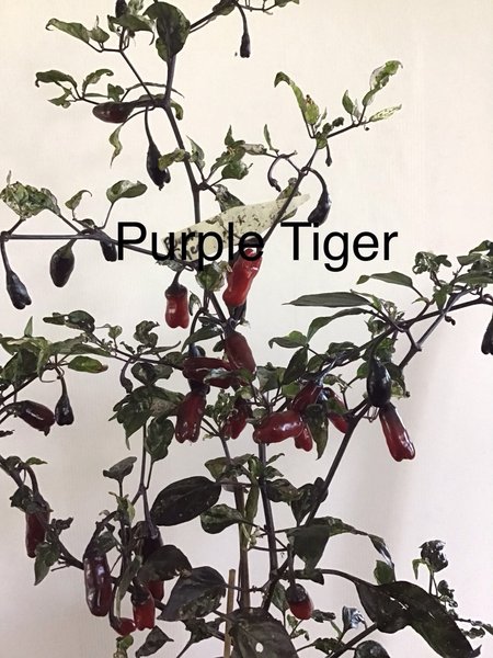 Purple Tiger. Styrka 2500-5000 SHU. Dekorativ chilisort med olikfärgade löv i grönt/vitt/lila. Droppformade små frukter som mognar från lilagrönt till klarrött. Kompakt planta.