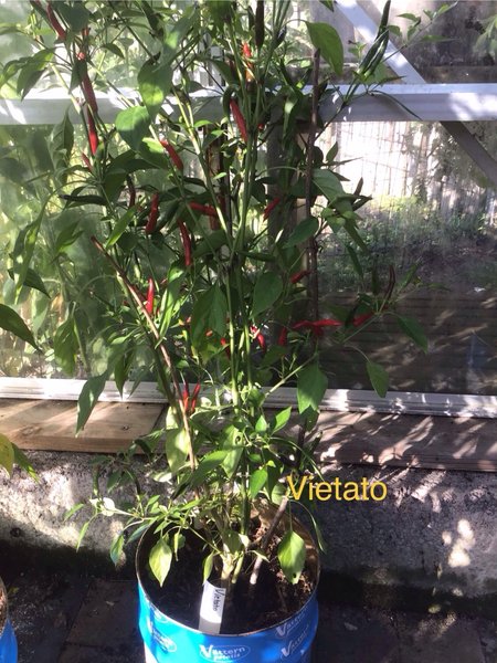 Vietato. Styrka 75000-100000 SHU. Ca 40 cm hög planta med mörka blad. Frukterna blir först svarta, sedan röda.