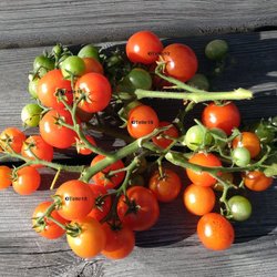 Får gula runda körsbärstomater i storlek av små plommon.
