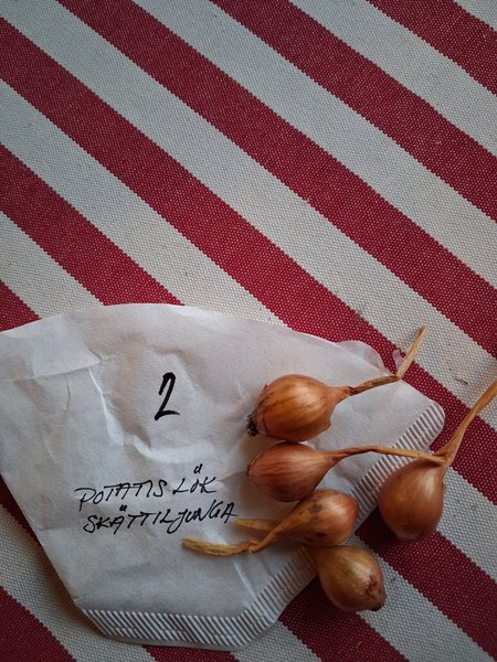 Lökarna på bilden. 5 st sättlökar av potatislök. Kulturarv. Lättodlade lökar som bildar knippen, som schalottenlök. Väldigt lagringsduglig och med god leksak.