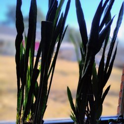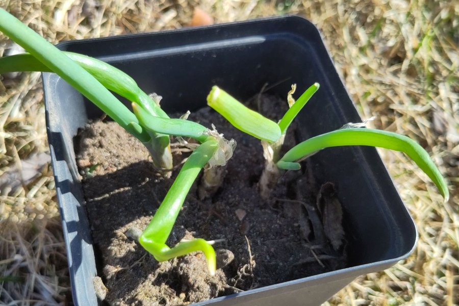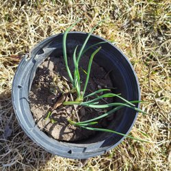 Tre fjolårsplantor av piplök, de på bilden. De har stått i krukan sedan förra sommaren.