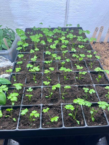 Plantorna är odlade från frö och har utvecklat flera bladpar. Fått en omplantering. Mycket fina och stadiga.