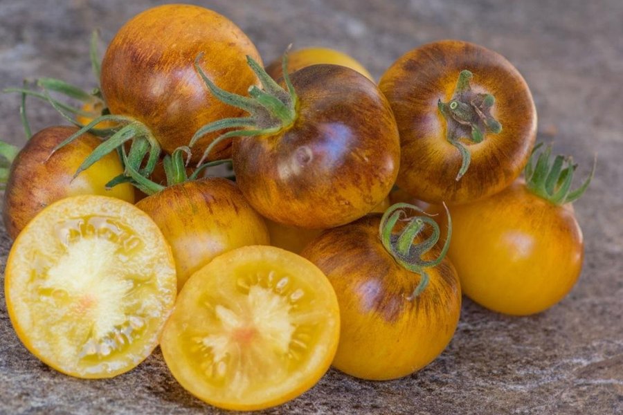 Små gula tomater med blåsvarta skuldror