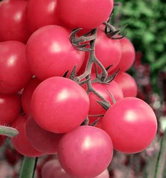Får stora skördar med kluster av runda, små, hallonfärgade körsbärstomater, vikt 15-20 g