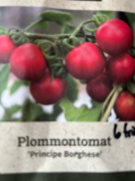 Plommontomat 'Principe Borghese' är en tomatsort känd för sina små, plommonformade frukter. Denna sort är populär för sin rika smak och passar utmärkt för att torka eller göra såser av. Tomaterna växer i klasar och har en djupröd färg när de är mogna.