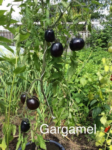 Ca 1,5 m hög. Mellanstor tomat. Svart nära stammen, orange med röda och bruna ränder längst upp.