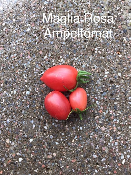 Ampeltomat med hängande växtsätt. Avlång, rosa stor körsbärstomat med spets.