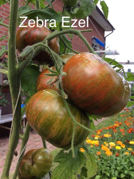 Högväxande gul-grön zebramönstrad tomat.