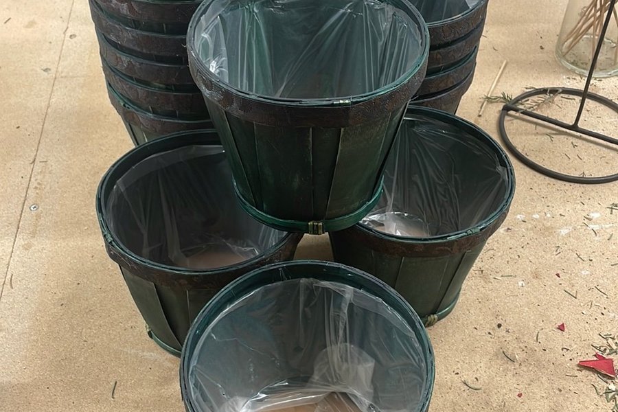 Ett set med gröna korgar, perfekta för plantering av växter. Varje korg är fodrad med plast. 14st
