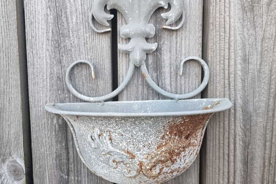 Dekorativ väggkruka i metall. Perfekt för att skapa en grönskande vägg. Har legat förvarad ute så därmed naturlig rost , ej använd. Mycket dekorativa ute i trädgården eller på balkongen/ altan. Har 3 till ute på auktion här på tradera om man skulle villja ha fler.