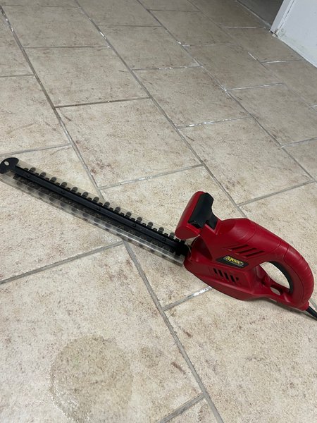 Mec trimmer för häckar och buskar. Trimmern är röd med svarta detaljer och har ett långt blad med skydd. Nästa är nytt