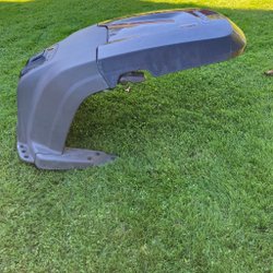 Robotgräsklipparen har mindre skador på tangenbordslock, transformator och 18V kabeln. Skadorna har inte påverkat funktionen. Karossen har synbart slitage med repmärken på sidorna.