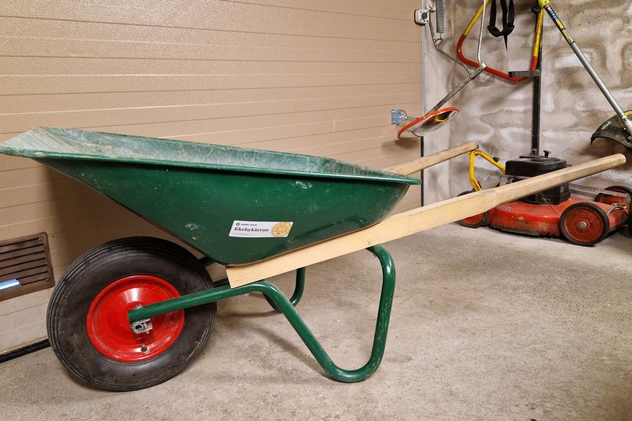 Skottkärra från Ekeby i grön färg med trähandtag och ett rött hjul. Lämplig för trädgårdsarbete och transport av material.