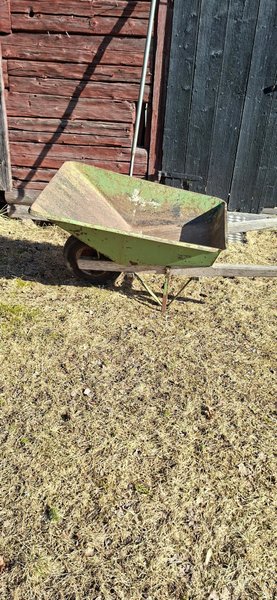 Skottkärra i grön färg. Perfekt för trädgårdsarbete och transport av material. Du kan lasta allt vad du orkar styra