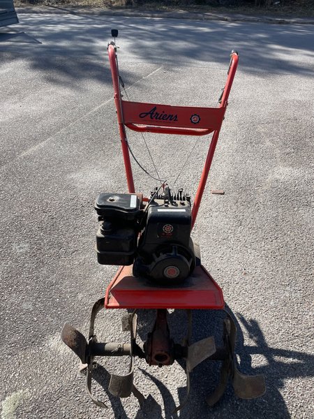 Jordfräs från Ariens med en 4 hästkrafters motor. Maskinen är röd och svart.