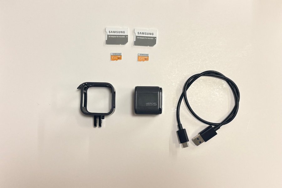 GoPro Hero5 Session med tillbehör. Inkluderar två 64GB Samsung EVO micro SD kort och adaptrar samt ram och USB-C kabel.