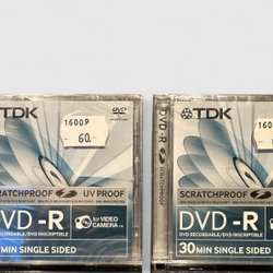 Ett paket med 3 stycken TDK DVD-R skivor. Varje skiva har en kapacitet på 1.46GB och kan spela in upp till 30 minuters video. Perfekt för videokameror. Ny oöppnad förpackning.