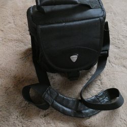 Svart kameraväska från Lowepro med justerbar axelrem. Väskan har flera fack för förvaring.