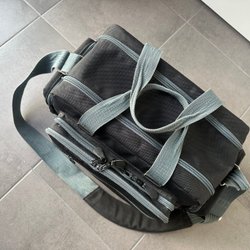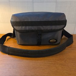 Grå kameraväska med justerbar axelrem och handtag. Väskan har flera fack för förvaring.