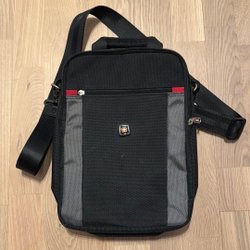 Svart kameraväska med axelrem. Väskan har flera fack för förvaring.