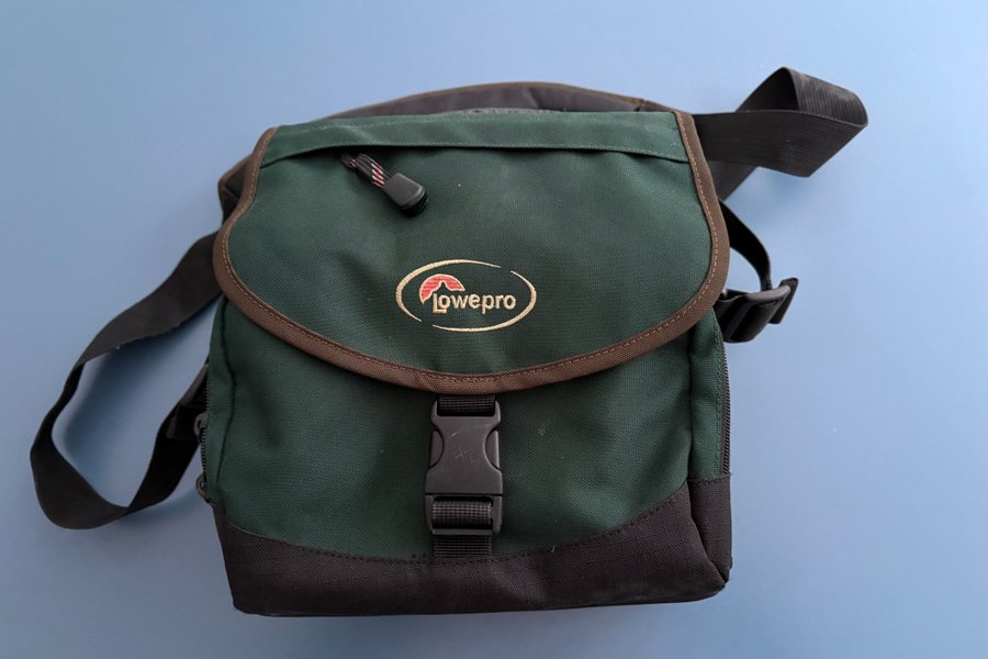 Kameraväska från Lowepro i mörkgrön och svart färg. Väskan har en justerbar axelrem och ett spänne framtill för att säkra locket. Det finns en dragkedja på sidan för extra förvaring.