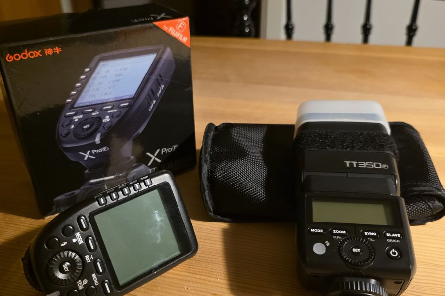 Säljer en Godox TT350F blixt och en Godox XProF sändare. Båda är kompatibla med Fujifilm kameror. Blixten kommer med ett fodral.