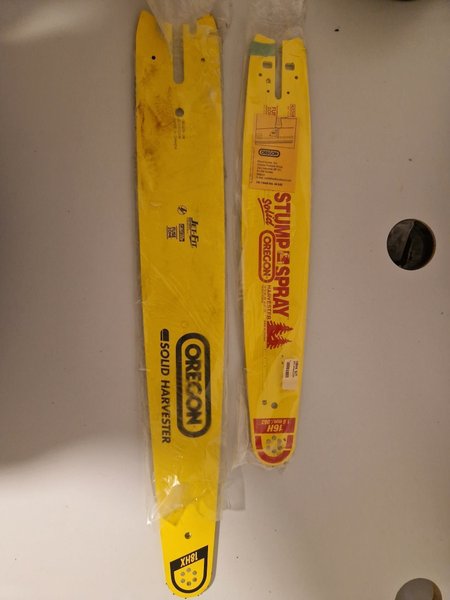 Två Oregon sågsvärd. Det ena är ett Solid Harvester 18HX svärd och det andra är ett Stump Spray Harvester 16HX svärd.