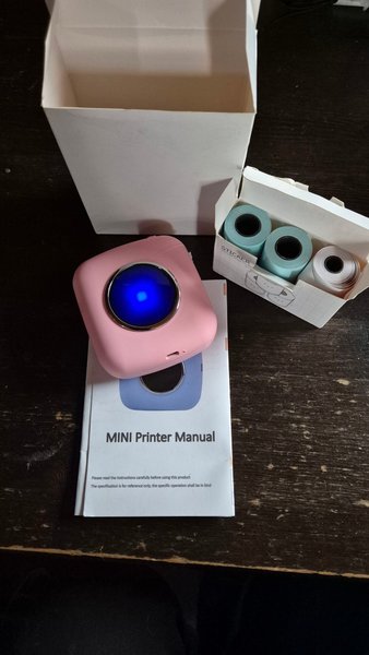 Mini Printer i rosa färg. Manual medföljer. Tre rullar medföljer, varav två är klister etiketter och en är vanligt papper.