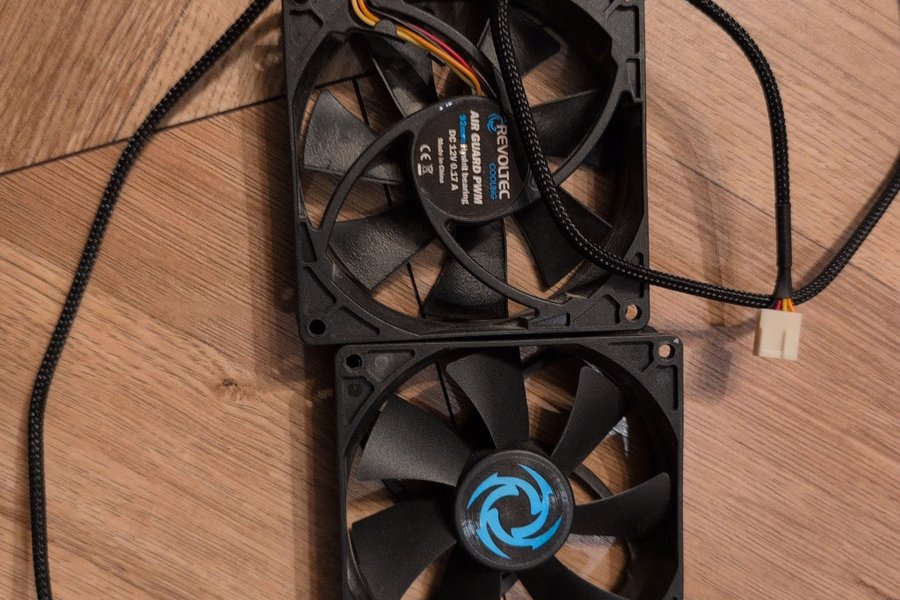 Två datorfläktar säljes. Den ena är en Revoltec Air Guard PWM 92mm fläkt. Den andra är en fläkt med en blå logo i mitten.