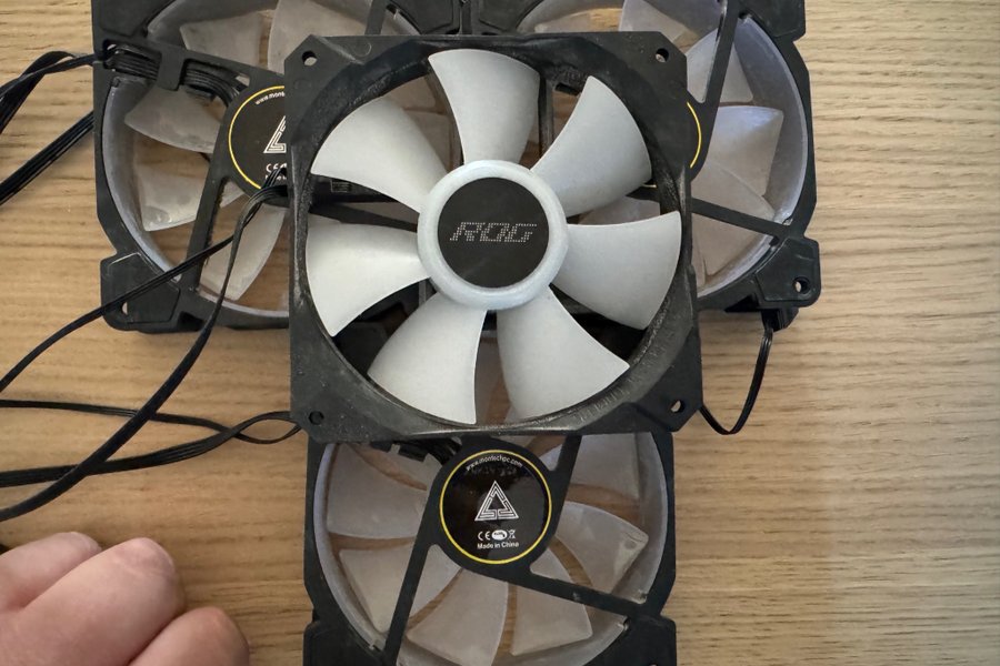 Fyra fläktar för datorchassi. En av fläktarna har en ROG-logotyp i mitten. En annan fläkt har en etikett med texten "www.montechpc.com", "CE", "RoHS" och "Made in China".