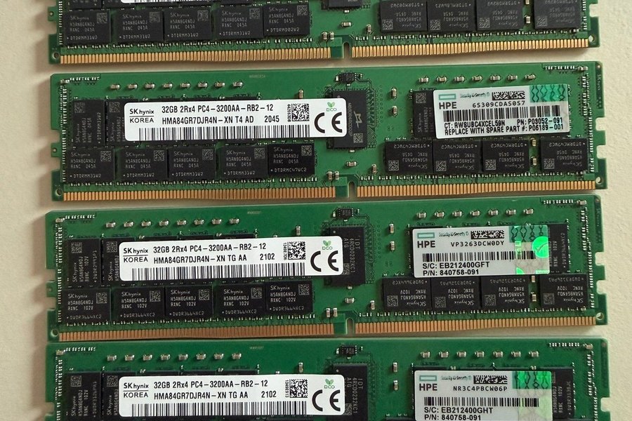 Fyra stycken SK Hynix 32GB DDR4 ECC RDIMM RAM-moduler. Specifikationerna är 2Rx4 PC4-3200AA-RB2-12. Modellnumret är HMA84GR7DJR4N.