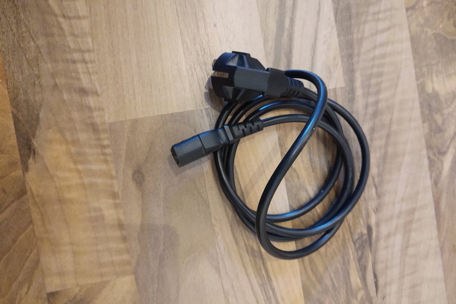 Strömkabel för elektronik. Kabeln har en standard CEE 7/7 Schuko-kontakt i ena änden och en IEC C13-kontakt i den andra änden. Lämplig för att ansluta datorer, skärmar och andra elektroniska enheter till ett vägguttag.