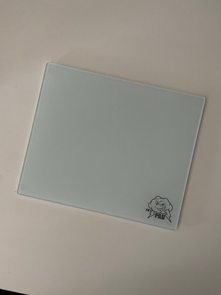 SkyPAD musemåtte i glas. Musemåtten har et logo med en sky og teksten "SKY PAD" med lyn. Nypris 1400