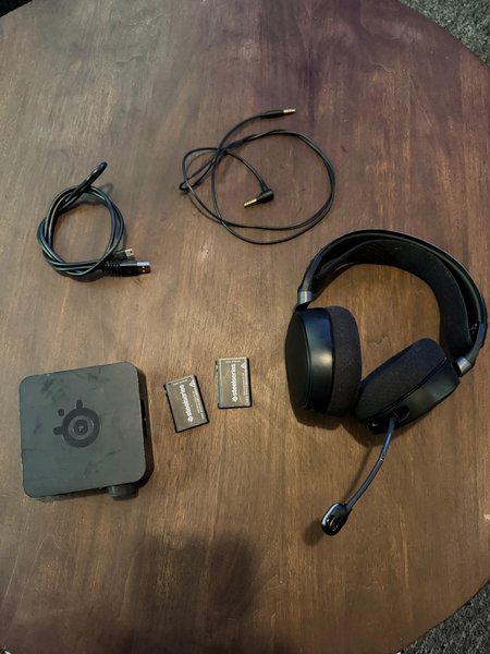 SteelSeries Arctis Pro Wireless gamingheadset med en trådlös sändare och två utbytbara batterier. Premiumlurar som exempelvis har den sällsynta funktionen att kunna koppla exempelvis telefon via bluetooth och strömma ljud från datorn samtidigt.