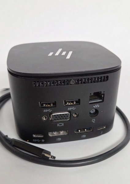 Dockningsstation från HP. Ansluts via USB-C. Har flera portar inklusive USB-A, VGA, DisplayPort, Ethernet och strömingång.