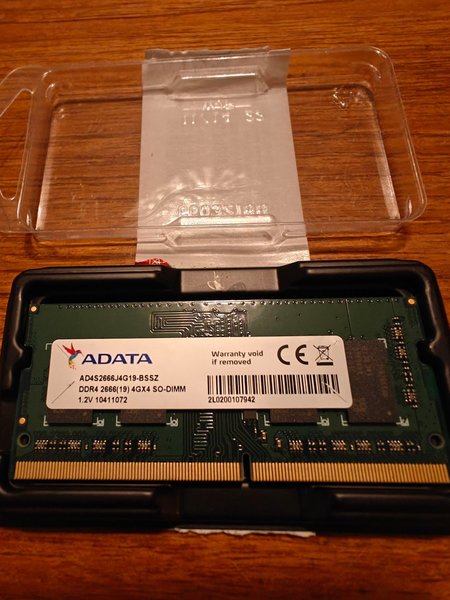 ADATA DDR4 2666(19) 4GX4 SO-DIMM, 1.2V. Modellnummer: AD4S2666J4G19-BSSZ. Serienummer: 2L0200107942.