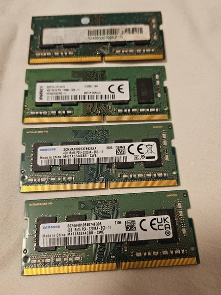 Fyra RAM-minnen säljes. 1x Kingston 4GB 1Rx16 PC4-2666V-SCD-11 3x Samsung 4GB 1Rx16 PC4-3200AA-SCO-11