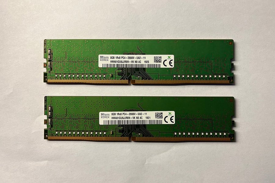 Två stycken SK Hynix 8GB 1Rx8 PC4-2666V-UA2-11 DDR4 RAM-moduler.