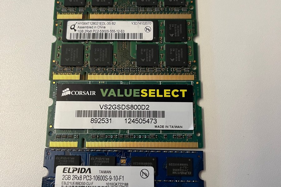 Fyra RAM-minnen. Två HYS64T128021EDL-3S-B2 1GB 2Rx8 PC2-5300S-555-12-E0, ett Corsair VS2GSDS800D2 och ett Elpida EBJ21UE8BDS0-DJ-F 2GB 2Rx8 PC3-10600S-9-10-F1.