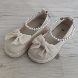 Ett par söta vita ballerinaskor med rem och dekorativa volanger framtill. Perfekt för festliga tillfällen eller som en fin detalj i vardagen. Storlek 29, rök och djurfritt hem.