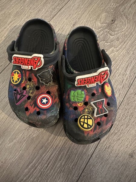 Storlek J2. (EU 33/34) Ett par Crocs tofflor med Marvel Avengers tema. Perfekt för alla små superhjältar!